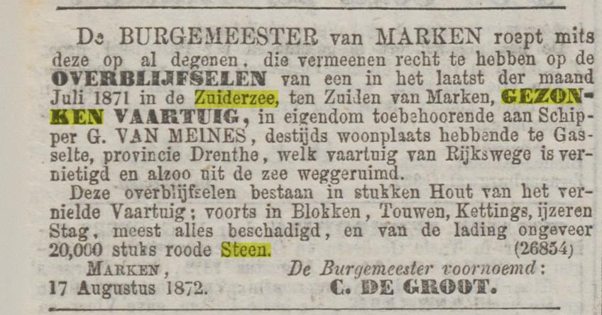 Scheepswrak ZA 97 dat in 1981 bij Almere werd opgegraven stond 40 jaar lang anoniem beschreven als ‘een tjalk uit de tweede helft van de 19e eeuw’. Een nogal beperkte en weinig aansprekende vermelding in de archieven van de RIJP (Rijksdienst voor de IJsselmeerpolders). Maar na nieuw en uitvoerig onderzoek is het maritiem archeoloog Yftinus van Popta in 2022 gelukt om dit wrak te identificeren. De historische en cryptische omschrijving van de rampplek in een bericht in de Staatscourant van 5 augustus 1871 was daarbij doorslaggevend: “de kerktoren van Volendam een handspaaklengte beoosten de oostelijkste buurt van Marken, en de molens van Uitdam met de roeden aan elkaar”. Precies op de plek waar die beide zichtlijnen elkaar kruisen, blijkt scheepswrak ZA 97 te liggen. Vanaf dat moment is wrak ZA 97 niet langer een onbeduidende 19e-eeuwse tjalk, maar de Hoop op Zegen van schipper Gerrit van Meines die op 20 juli 1871 op de Zuiderzee verging. Achter het wrak blijkt een bijzonder verhaal schuil te gaan van een ietwat opvliegende schipper die heel Nederland doorreisde en na de scheepsramp zelfs voor de rechter moest verschijnen. Niemand had tot voor kort ooit van Van Meines gehoord, maar vanaf nu is hij onderdeel geworden van het verhaal van Flevoland.